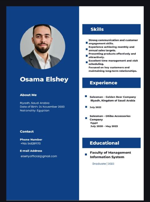 يسعدني أن أشارك معكم نبذة عن مسيرتي المهنية وخبراتي العملية. أنا أسامة محمد، مقيم حاليا في الرياض، وامتلك خلفية قوية وخبرة واسعة في عدة مجالات حيوية تتكامل فيما بينها لتقديم قيمة مضافة في بيئة العمل. تشمل خبرتي المجالات التالية المبيعات بناء علاقات قوية مع العملاء، تحقيق الأهداف البيعية، وتطوير استراتيجيات فعالة لزيادة الأرباح. الاستقبال إدارة الواجهة الأمامية للشركة بكفاءة، ضمان تجربة عملاء م