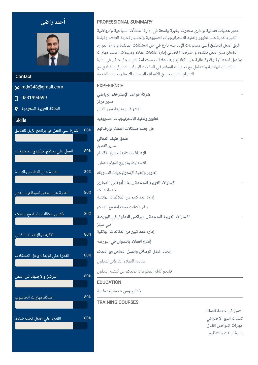 مدير عمليات فندقية واداري محترف بخبرة واسعة في إدارة المنشاءات السياحية والرياضية أتميز بالقدرة على تطوير وتنفيذ الاستراتيجيات التسويقية وتحسين تجربة العملاء وقيادة فرق العمل لتحقيق أعلى مستويات الانتاجية بارع في حل المشكلات المعقدة وإدارة الموارد لضمان سير العمل بكفاءة واحترفيه أخصائي إدارة علاقات عملاء ومبيعات امتلك مهارات تواصل استثنائية وقدرة عالية على الاقناع وبناء علاقات مستدامة لدي سجل حافل