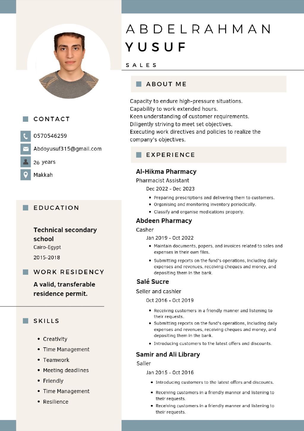 عبدالرحمن من مصر العمر 26 سنة اشتغلت في مجال المبيعات بائع في محلات عطور ومحلات حلويات واجهزة واشتغلت موارد بشرية وشؤون موظفين محتاج أي شغال مناسب
