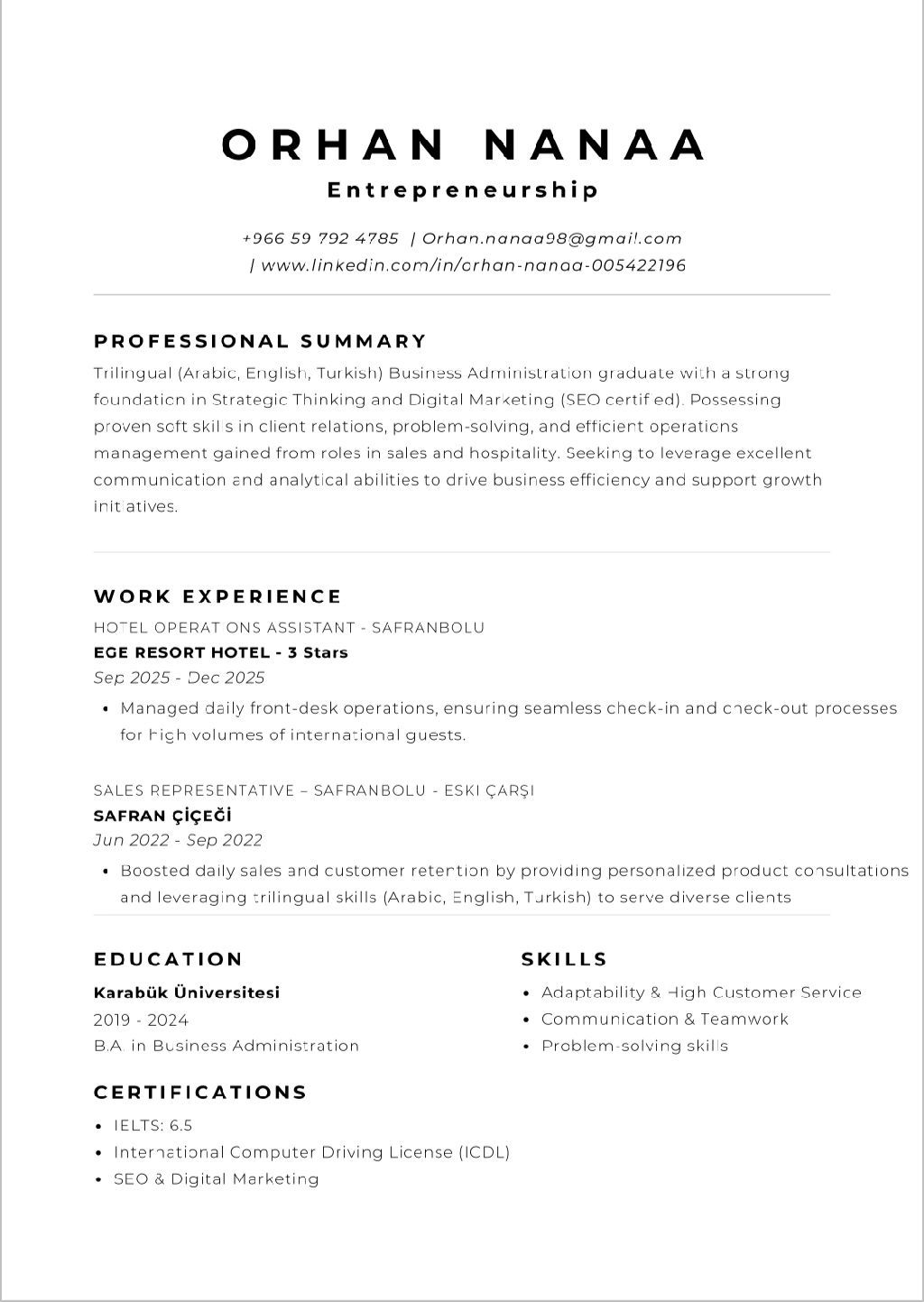 ابحث عن فرصة عمل في قسم الاستقبال داخل فندق، حيث امتلك خبرة سابقة في فندق 3 نجوم في تركيا، وكنت مسؤولا عن مهام متعددة تشمل استقبال الضيوف وانهاء اجراءات الدخول والخروج إدارة الحجوزات والتنسيق مع جميع الأقسام تجهيز البوفيه والاشراف على جودة التقديم المساعدة في خدمة الغرف وتلبية طلبات الضيوف أتقن العربية والانجليزية والتركية، مما يمنحني قدرة ممتازة على التواصل مع ضيوف من جنسيات مختلفة
