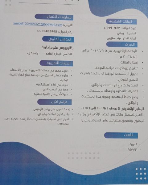 الجنسية اليمن مدخل بيانات امتلك خبرة ببرنامج اكسل وال word كتابة تقارير وتسجيل الحسابات