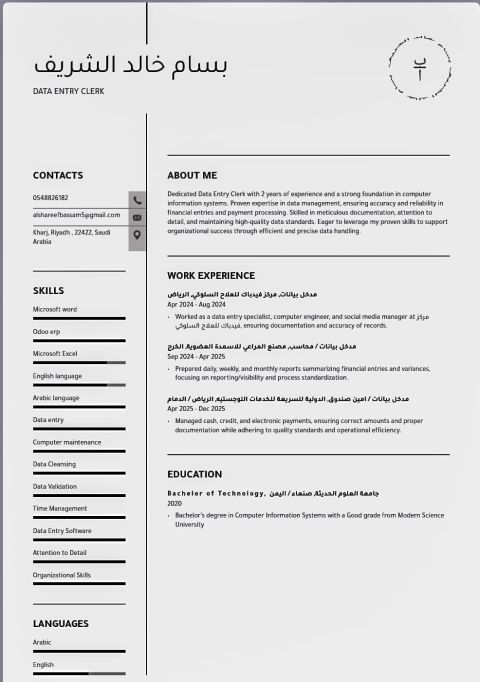 مدخل بيانات أمين صندوق الهدف الوظيفي السعي للحصول على وظيفة بدوام كامل كأمين صندوق ومدخل بيانات في بيئة عمل ديناميكية تتطلب الدقة والمهارات التنظيمية القوية. الخبرات والمهارات خبرة مثبتة في معالجة المعاملات النقدية والتعامل مع العملاء. مهارات قوية في ادخال البيانات بدقة وسرعة. اجادة تامة لجميع برامج Microsoft Office (Word, Excel, PowerPoint, Outlook) قدرة ممتازة على التعامل مع أنظمة نقاط البيع