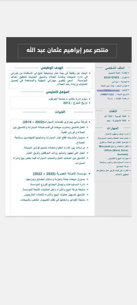 ابحث حاليا عن فرصة عمل في المملكة العربية السعودية مع جاهزية فورية للانضمام. لدي خبرة لمدة 3 سنوات في الدعم الاداري، ادخال البيانات، استخدام برامج مايكروسوفت أوفيس، إدارة المستندات، والدعم الفني الأساسي. أتميز بالانضباط، والاعتمادية، والقدرة على العمل تحت الضغط مع سرعة في التعلم وضمان سير العمل بكفاءة. والى جانب مهاراتي الأساسية، أنا مستعد للعمل في أي نوع من الأعمال التي تحتاجها الجهة