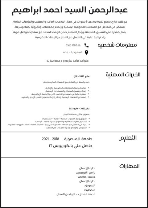 موظف خدمات حكومية وعقارية خبرة أكثر من 4 سنين في الخدمات وسنة في العقارات أجيد التعامل مع الكومبيوتر وبرامج الأوفيس وتنسيق المستندات الرسمية ومتابعة وانهاء المعاملات وخدمة العملاء بشكل جيد
