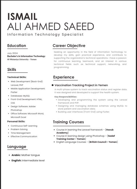 خريج بكالوريوس تقنية معلومات، وابحث عن فرصة عمل كمدخل بيانات. عندي معرفة جيدة بالحاسب الآلي والقدرة على ادخال وترتيب البيانات بدقة. ملتزم وجاهز للعمل فورا