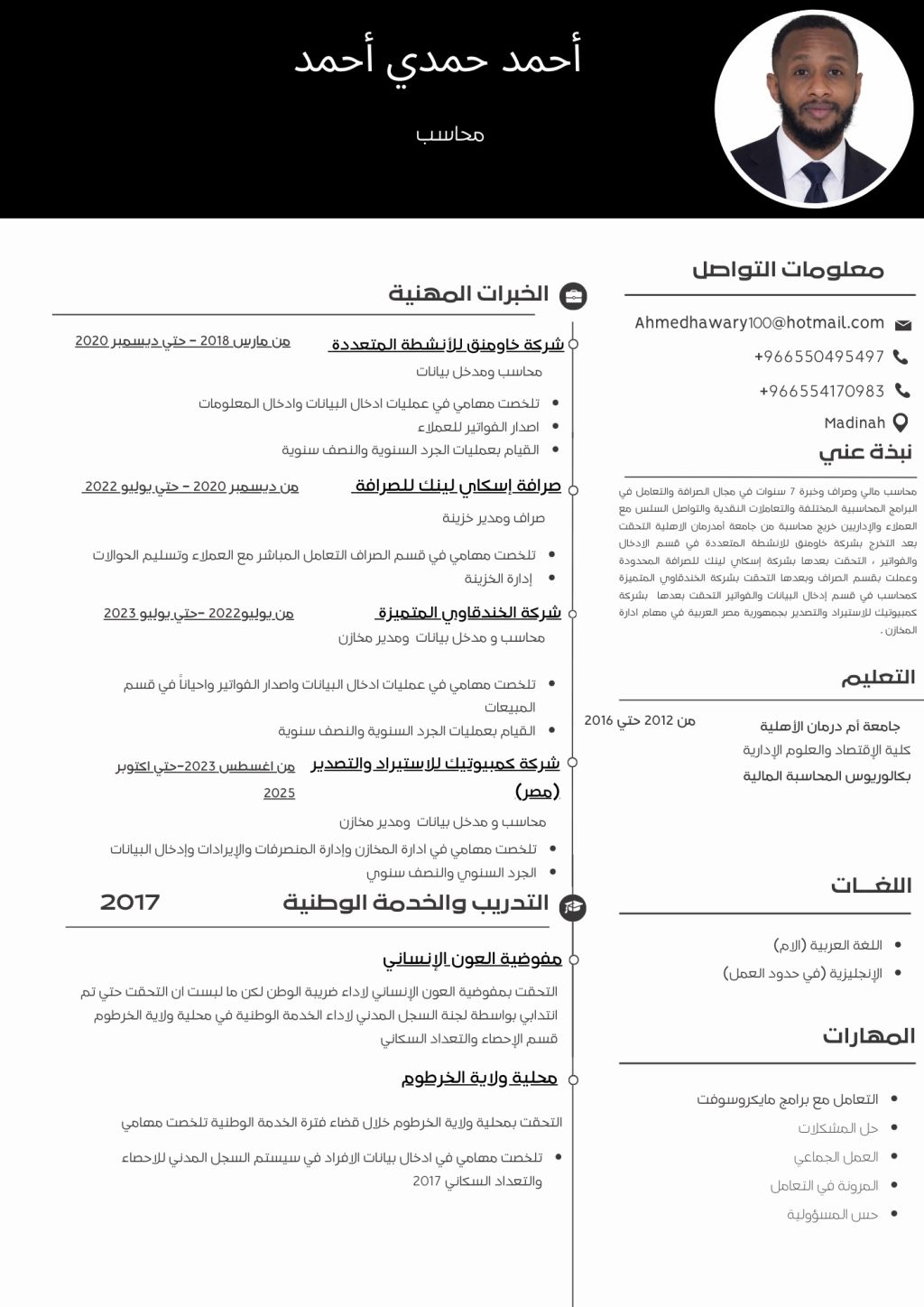محاسب ومدخل بيانات ومدير مخازن خبرة 8 سنوات ولله الحمد اجادة التعامل مع البرامج المحاسبية متواجد في المملكة العربية السعودية في المدينة المنورة وجاهز للعمل في أي مكان في المملكة