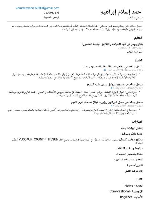 Egyptian job seeker with experience in data entry, daily journal entries, and sales representative management. Experienced in sales, inventory management, office work, and cataloging systems. Experienced in the food industry, including order registration, invoice entry, price adjustments, barcode generation, and overall workflow management. Experienced in restaurants, various point - of - sale (POS)