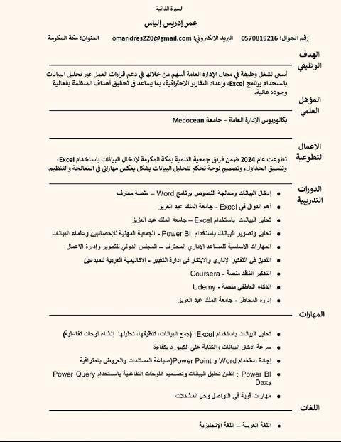 الموضوع طلب فرصة عمل - محلل بيانات، أرفق لسيادتكم سيرتي الذاتية للتقدم الى وظيفة محلل بيانات. أحمل درجة البكالوريوس في الإدارة العامة، ولدي خبرة عملية في تحليل البيانات باستخدام أدوات Excel وPower BI لاعداد تقارير تفاعلية تدعم اتخاذ القرارات الاستراتيجية. أتميز بقدرتي على معالجة البيانات، واستخلاص المؤشرات الرئيسية، وتقديم توصيات مبنية على تحليل دقيق وموثوق