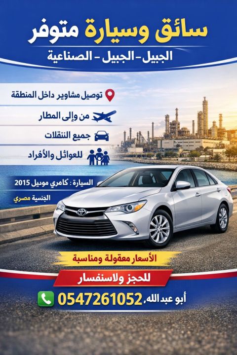 سائق وسيارة متوفر الجبيل - الصناعية توصيل مشاوير داخل المنطقة توصيل من والى المطار جميع التنقلات خدمة العائلات والأفراد السيارة كامري موديل 2015 جنسية السائق مصري الأسعار معقولة ومناسبة للحجز والاستفسار (اتصال