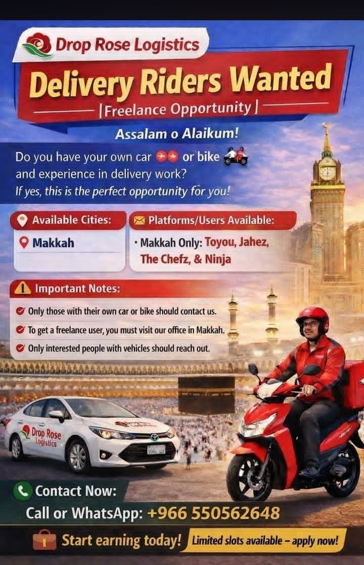 Drop Rose Logistics Delivery Riders Wanted (Freelance Opportunity) Do you have your own car or bike and experience in delivery work If yes, this is the perfect opportunity for you Available Cities Mecca Platforms/ Users Available Mecca