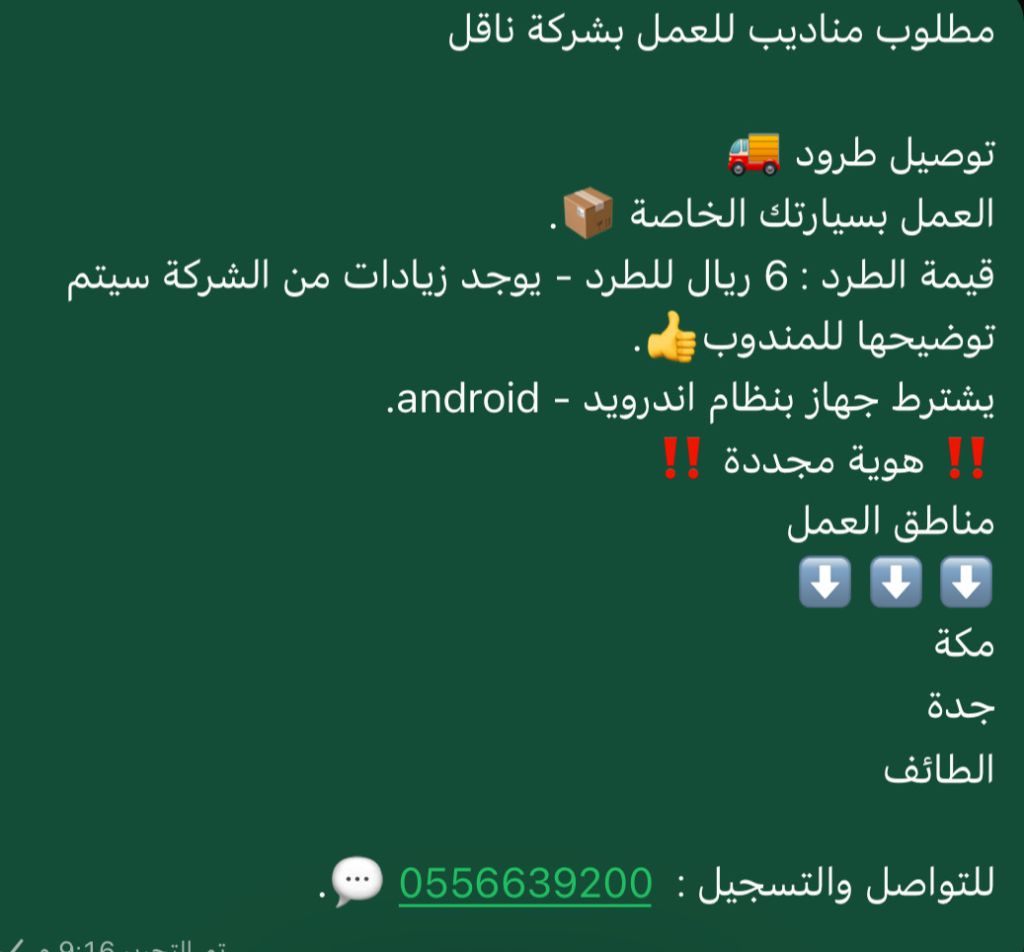 مطلوب مناديب توصيل طرود العمل بسيارتك الخاصة. قيمة الطرد 6 ريال للطرد - يوجد زيادات من الشركة سيتم توضيحها للمندوب. يشترط جهاز بنظام اندرويد - Android. هوية مجددة مناطق العمل مكة حي الزايدي للتواصل والتسجيل