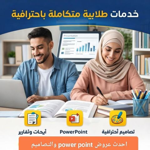 خدمات طلابية متكاملة باحترافية عالية بقدم خدمات طلابية لطلاب المدارس والجامعات بجودة عالية وتسليم في الوقت اعداد أبحاث وتقارير بطريقة منظمة واحترافية تصميم عروض PowerPoint جذابة وسهلة الشرح تنسيق المشاريع والواجبات بشكل أكاديمي تصاميم مميزة للعروض والملفات مراعاة متطلبات المعلمين والدكاترة شغل منظم - تصميم جذاب - محتوى واضح التزام بالمواعيد مناسب لجميع المراحل الدراسية