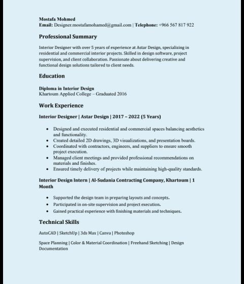 مصمم داخلي بخبرة تزيد عن 5 سنوات في شركة أستار ديزاين، متخصص في المشاريع الداخلية السكنية والتجارية. ماهر في برامج التصميم، والاشراف على المشاريع، والتعاون مع العملاء. شغوف بتقديم حلول تصميم ابداعية وعملية مصممة خصيصا لتلبية احتياجات العملاء