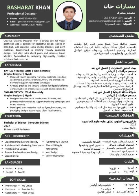 ابحث عن فرصة عمل مصمم جرافيك وفني طباعة بخبرة في مجال الدعاية والاعلان، أتقن برامج Adobe (Photoshop - Illustrator - InDesign) وخبرة بسيطة برامج المونتاج (Premiere - After Effects - Filmora) مع خبرة في Microsoft Office واستخدام الذكاء الاصطناعي في التصميم. متمكن من تشغيل ماكينات الأوتدور والطباعة الديجيتال وتجهيز الملفات للطباعة. جاهز للعمل فورا، مقيم في السعودية بإقامة سارية قابلة للنقل