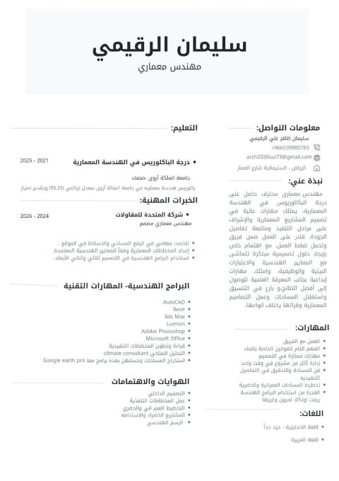 مهندس تصميم معماري ذو خبرة 10 سنوات (سنتان في شركة تطوير عقاري - سنة بشركة استشارات هندسية) في السعودية أقوم بعمل تصاميم معمارية ابداعية ووظيفية وفقا لمتطلبات العميل والمشروع. اعداد المخططات ثنائية وثلاثية الأبعاد باستخدام برامج (3ds Max - AutoCAD - Adobe Photoshop) مسجل بالهيئة السعودية للمهندسين