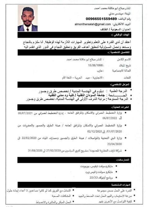 أنا المنذر صلاح خريج هندسة مدنية جامعة السودان سوداني الجنسية لدي سنتين من الخبرة باحث عن وظيفة في المجالات الهندسية أو الادارية أو تقنية أو حرفية أو وظيفة لائقة ومرموقة في شتى المجالات أو في مجال الاشراف، مكان الإقامة جدة