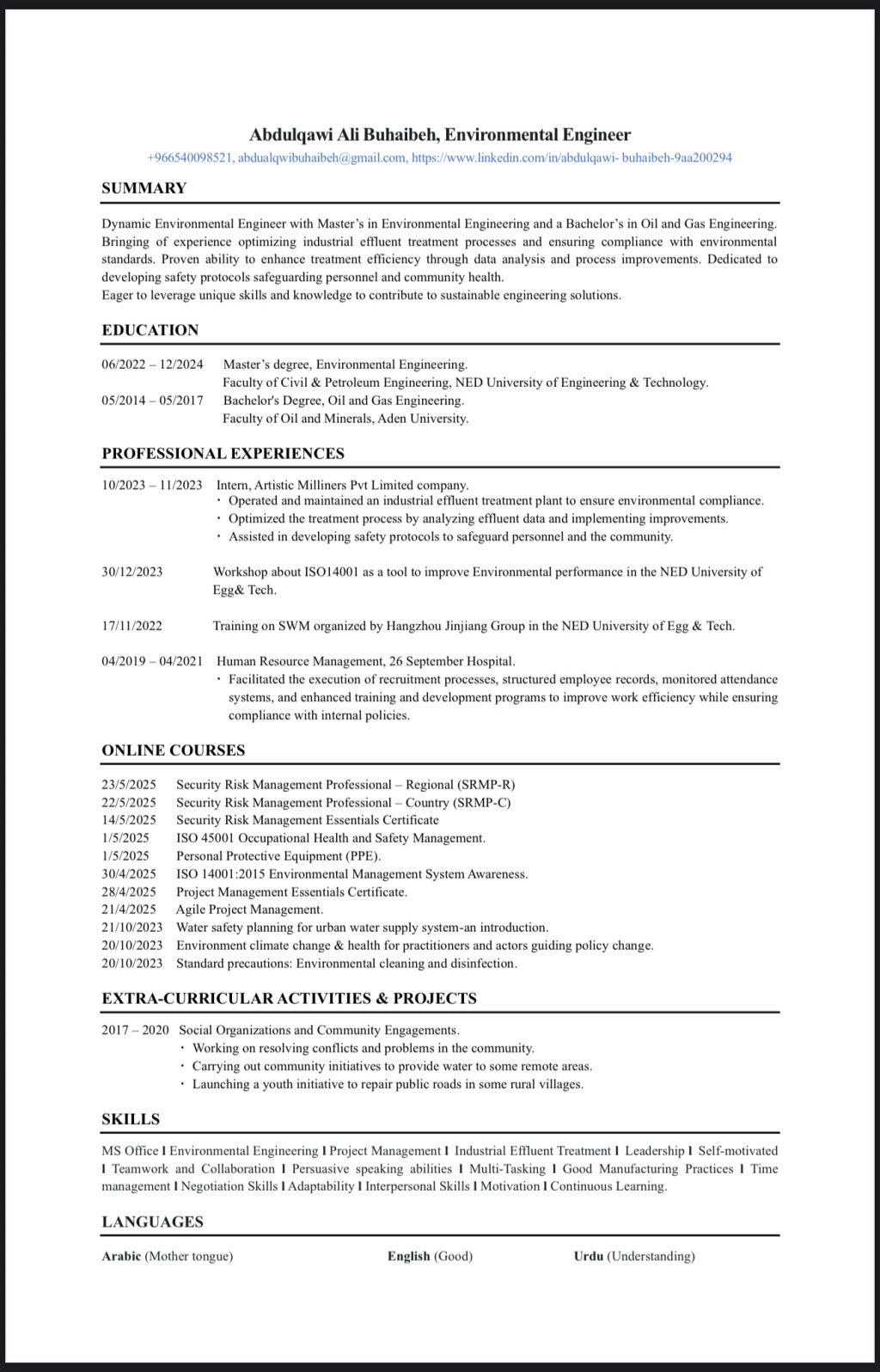 مطلوب وظيفة ليمني مهندس بيئي ديناميكي حاصل على ماجستير في الهندسة البيئية وبكالوريوس