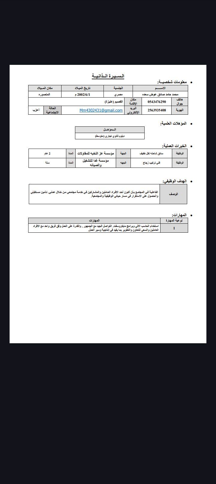 سائق شاحنة صغيرة معي رخصة قيادة نقل خفيف واشتغلت في مؤسسة مقاولات عندي خبرة في تركيب أكسسوارات السباكه والكهرباء توصيل أفياش تركيب لمبات تركيب زجاج وعدة مهارات أخرى وسائق دينا بوينش