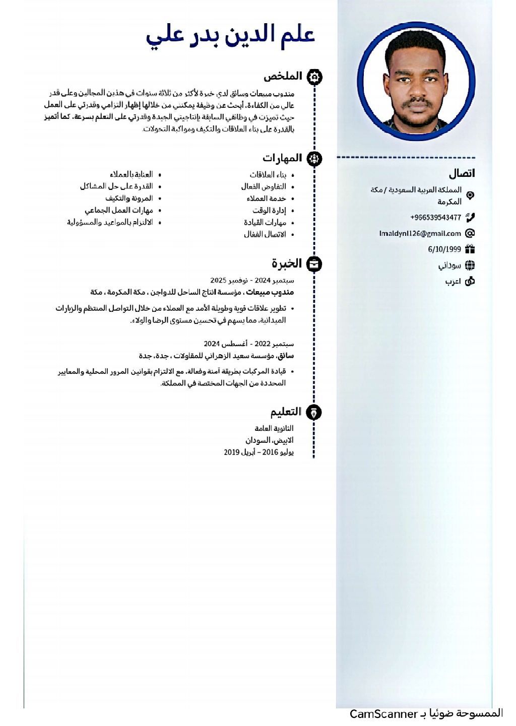 الاسم علم الدين بدر سوداني الجنسية المهنة سائق شاحنة صغيرة الرخصة نقل خفيف ذات خبرة في القيادة متواجد في مكة المكرمة
