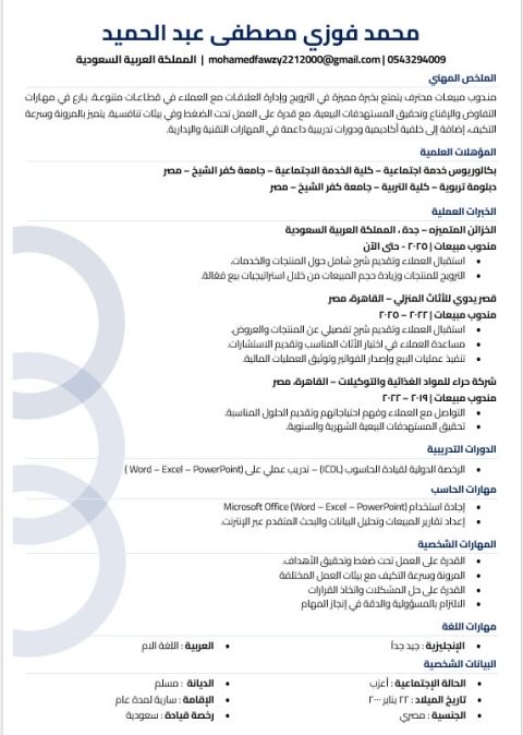 مقيم في جدة، مصري الجنسية، مستعد للعمل فورا في أي مكان داخل السعودية. عندي خبرة في الاشراف على العمال، أمين مخزن، كاشير، البيع وخدمة العملاء، ومعيا إقامة نظامية ورخصة قيادة. قادر على تحمل ضغط العمل والعمل بروح الفريق، ومستعد للتنقل لأي مدينة اذا لزم الأمر. للتواصل