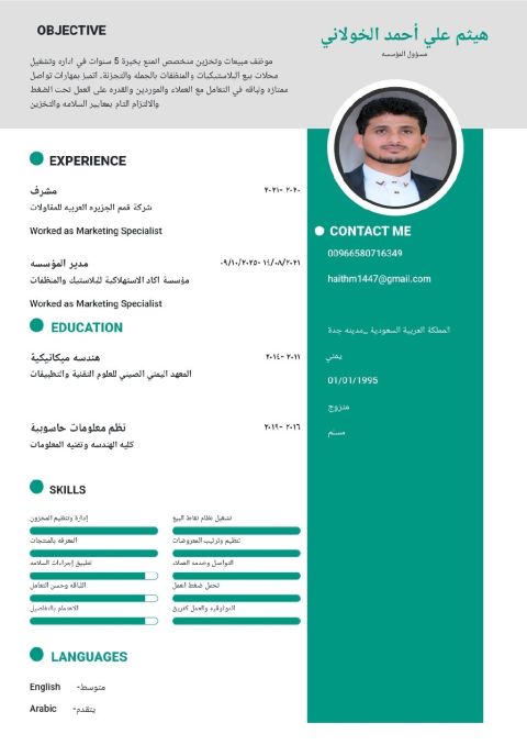 الجنسية يمني أملك شهادة بكالوريوس تقنية المعلومات ودبلوم مهندس برمجيات العمر 24 سنة إقامة سارية ورخصة سارية خبرات عملت معا شركة مقاولات ك مدخل بيانات - عملت في شركة كتب مدخل بيانات - خبرة في المنصات السعودية - خبرة ك منسق أعمال - خبرة في برامج الحاسوب