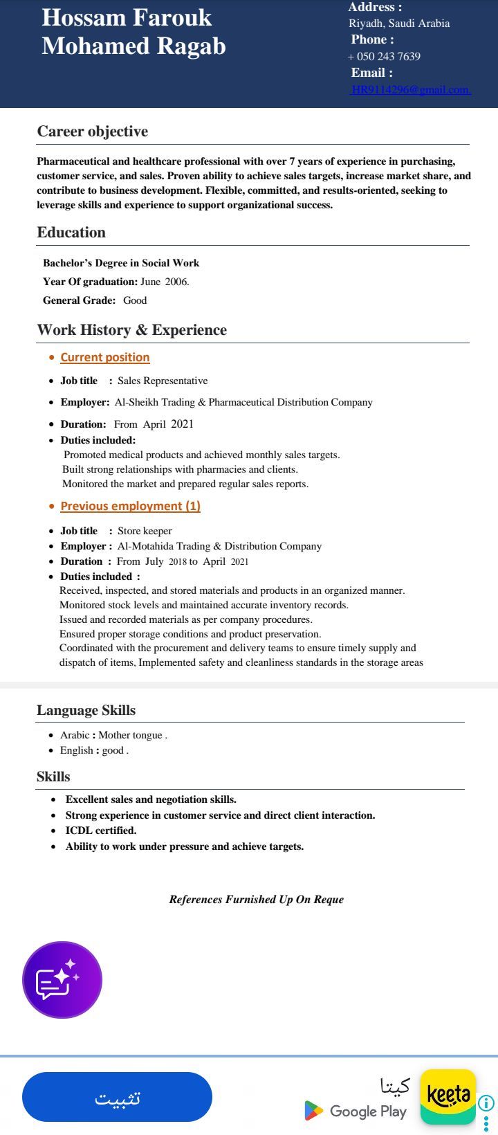 اعمل في مجال الادوية من 2011 لدى خبيره في قسم التحضير ومدير مخزن وادارة في حل الازمات وضغوط العمل والتسويق أون لاين (خدمة العملاء) والمشتريات
