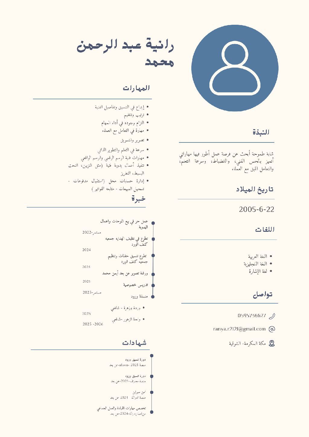 باحثة عن عمل لدي خبرة في خدمة العملاء وأتمتع باللباقة وسرعة التعلم. سبق لي العمل في تنسيق الورود، مدرسة خصوصية، وإدارة حسابات استقبال مدفوعات - تسجيل مبيعات) ابحث عن فرصة عمل مستقرة بدوام كامل أو جزئي. أفضل العمل في المناطق التالية الشوقية - بطحاء قريش - المحمدية - السبهاني) يفضل توفر مواصلات أن امكن، أو بدل مواصلات إن امكن. للتواصل عبر رسائل المكان مكة