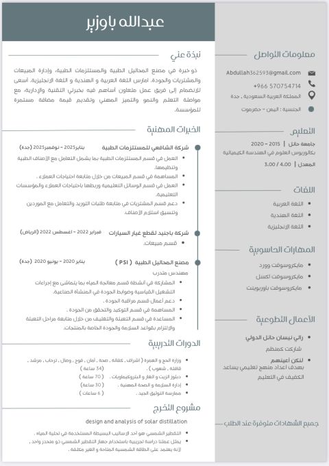 أمارس اللغة العربية والهندية واللغة الانجليزية أسعى للانضمام الى فريق عمل متعاون أساهم فيه بخبرتي التقنية والادارية، مع مواصلة التعلم والنمو والتميز المهني وتقديم قيمة مضافة مستمرة للمؤسسة ذو خبرة في مصنع المحاليل الطبية والمستلزمات الطبية، وإدارة المبيعات والمشتريات والجودة