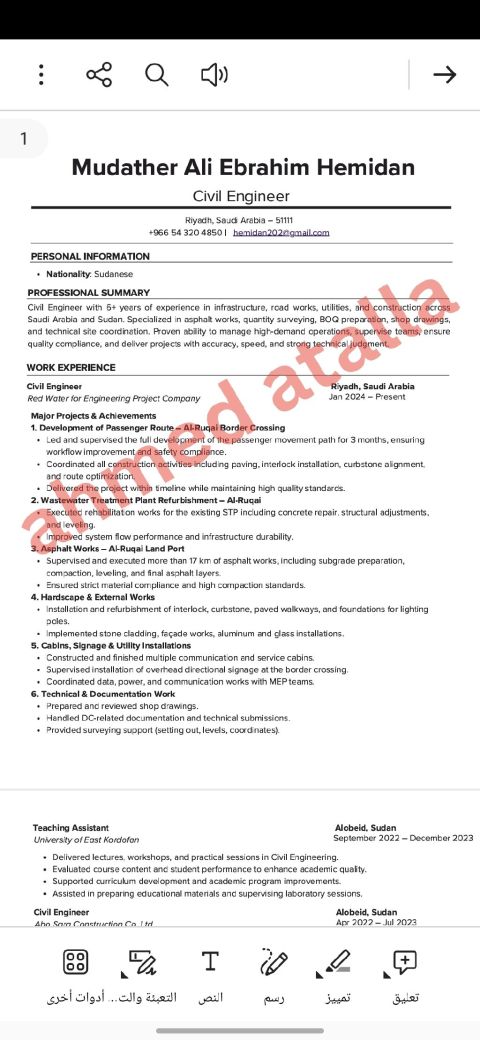 مهندس مدني طموح يتمتع بخبرة واسعة في التصميم والاشراف ع المشاريع الانشائية والبنية التحتية والمساحية، ابحث عن فرصة في بيئة عمل احترافية أستطيع من خلالها توظيف مهاراتي الهندسية في التخطيط والتحليل والتنفيذ والمساهمة في تحقيق أهداف المشاريع بكفاءة وجودة عالية، مع تطوير قدراتي الفنية والادارية باستمرار