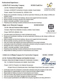 مهندس مدني متواجد في جدة مهندس تنفيذ ومكتب فني وحصر كميات انشائي ومعماري واعداد مستخلصات المقاولين والمالك خبرة خمس سنوات وثلاث سنوات في المملكة العربية السعودية ابحث عن فرصة عمل جاهز للعمل ونقل الكفالة ولدى رخصة قيادة سعودية وإقامة سارية
