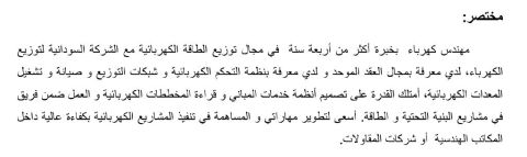 مهندس كهرباء بخبرة أكثر من أربعة سنة في مجال توزيع الطاقة الكهربائية مع الشركة السودانية لتوزيع الكهرباء، لدي معرفة بمجال العقد الموحد ولدي معرفة بنظمة التحكم الكهربائية وشبكات التوزيع وصيانة وتشغيل المعدات الكهربائية، امتلك القدرة على تصميم أنظمة خدمات المباني وقراءة المخططات الكهربائية والعمل ضمن فريق في مشاريع البنية التحتية والطاقة. أسعى لتطوير مهاراتي والمساهمة في تنفيذ المشاريع