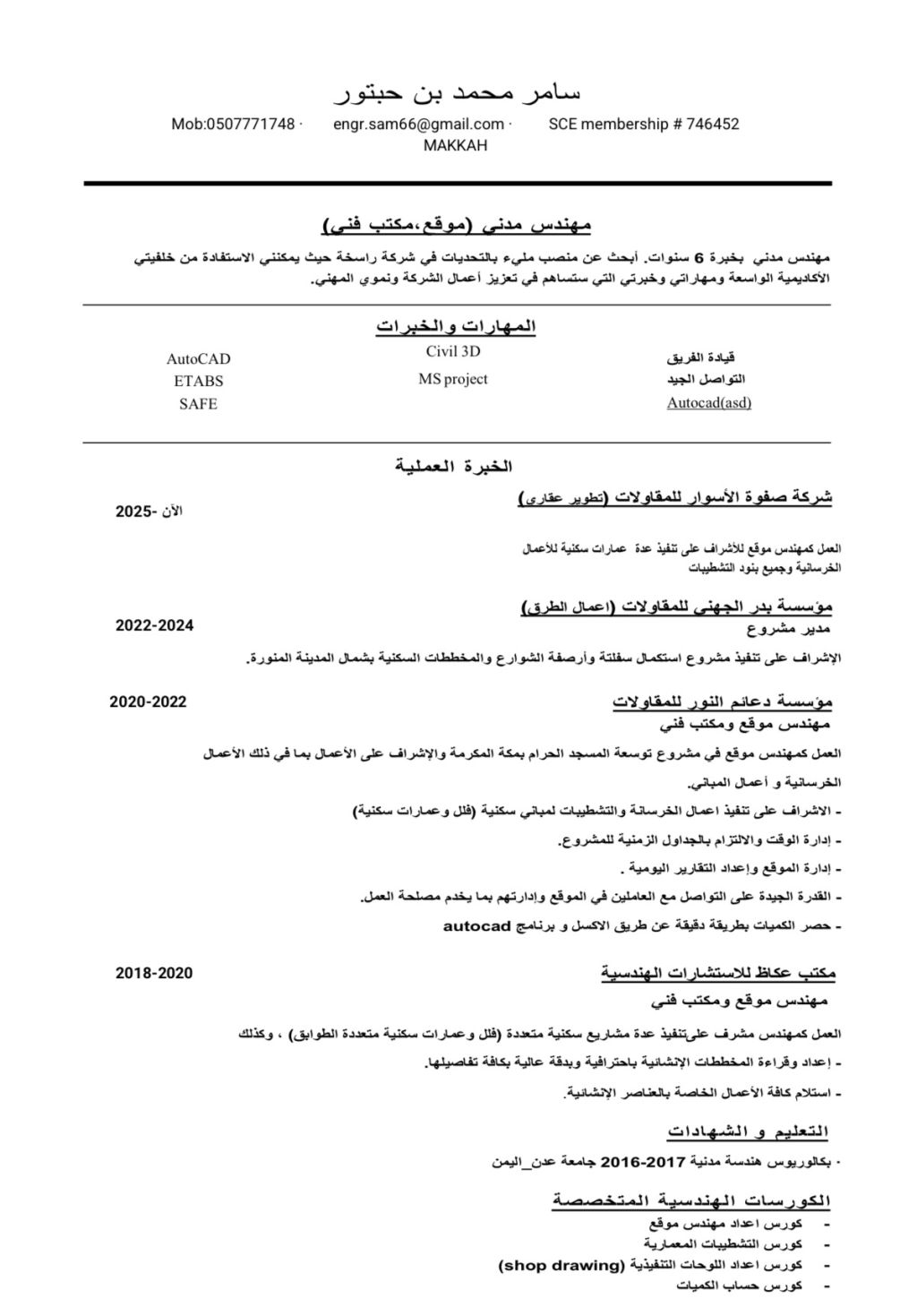 مهندس مدني ابحث عن فرصة عمل خبرة 6 سنوات في الاشراف على المواقع وتنفيذ الأعمال الخرسانية والتشطيبات بكفاءة عالية وتقديم التقارير الفنية، ملم بقراءة واعداد المخططات الانشائية وحساب الكميات باحترافية عن طريق AutoCAD وexcel. حاصل على عضوية هيئة المهندسين، إقامة سارية بمهنة مهندس مدني ورخصة قيادة سارية. جاهز للعمل فورا، لمراجعة أل CV التواصل