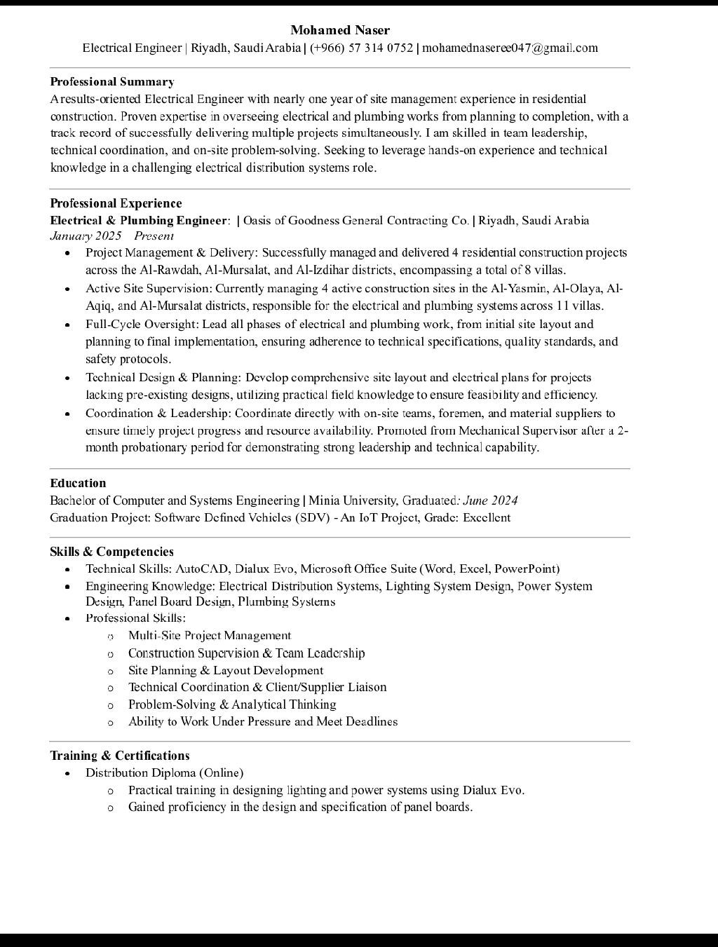 ابحث عن فرصة عمل ك مهندس كهرباء بخبرة 1 سنة مهندس موقع في السعودية مع شركة مقاولات ومطور عقاري مشاريع فلل سكنية من التأسيس الى التشطيب بعدد 7 مواقع في الرياض وامتلك إقامة سارية ورخصة قيادة وأعرف اشتغل تصميم وحصر أجيد استخدام برنامج الاوتوكاد والديلوكس ايفو وبرامج الأوفيس