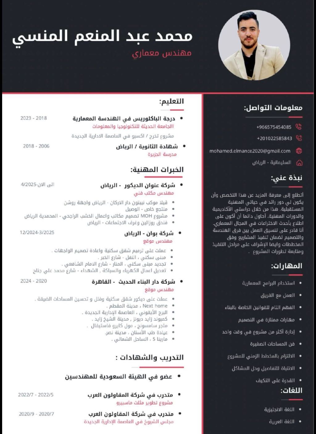 أنا مهندس معماري، عضو مسجل في نقابة المهندسين السعوديين امتلك مجموعة من المهارات والخبرات في مجال العمارة، من أبرزها الاشراف على أعمال التنفيذ. اعداد وتصميم المخططات المعمارية (الشوب دروينج)