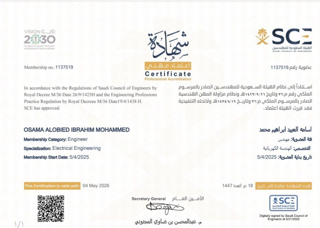 مهندس كهرباء عضو في هيئة المهندسين السعودين وخبرة في الشركة السودانية لتوزيع الكهرباء 5 عام في الضغط المتوسط والمنخفض، وبكالوريوس في الهندسة الكهربائية تخصص قدرة، لدي اقامة ورخصة قيادة وعضوية جميعهم ساريات. لغة عربية وانجليزية، أنا الآن متواجد في مكة. يمكنني الانتقال الى أي مكان في السعودية حيث مكان العمل