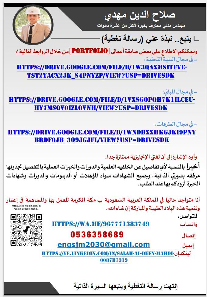 مهندس مدني محترف بخبرة أكثر من عشرة سنوات تدرج عملي في المباني عظم وتشطيبات في كافة أعمال الموقع كمهندس موقع في مجال المقاولات وكذا الاستشاري ثم في العمل الاستشاري كمهندس استشاري ثم مديرا على وحدة هندسية لمجموعة مهندسين مشرفين بالمشاريع الحكومية كما عملت مهندس جودة وإجمالا يمكنني العمل في جميع مراحل المشروع وادارتها بكفاءة بدءا من دراسات الجدوى والدراسات التفصيليه وصولا الى اغلاق المشروع وتسليمه