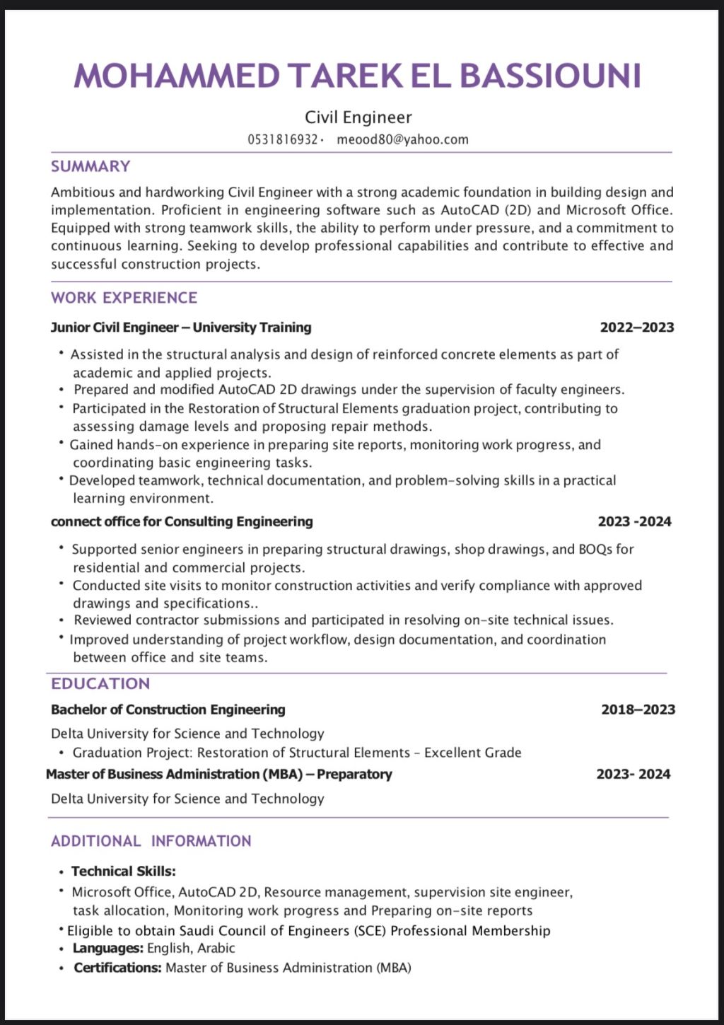 مهندس مدني خريج 2023 حاصل ع اعتماد الهيئة الهندسية السعودية اشتغلت سنة في مصر في شركة أل تي سي كونكت للاستشارات الهندسية بمشروع ألها بي لاند المنصورة عندي لغة انجليزية بنسبة 70% جاهز للعمل من غد موجود في الرياض