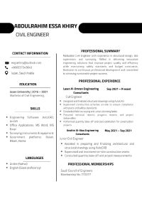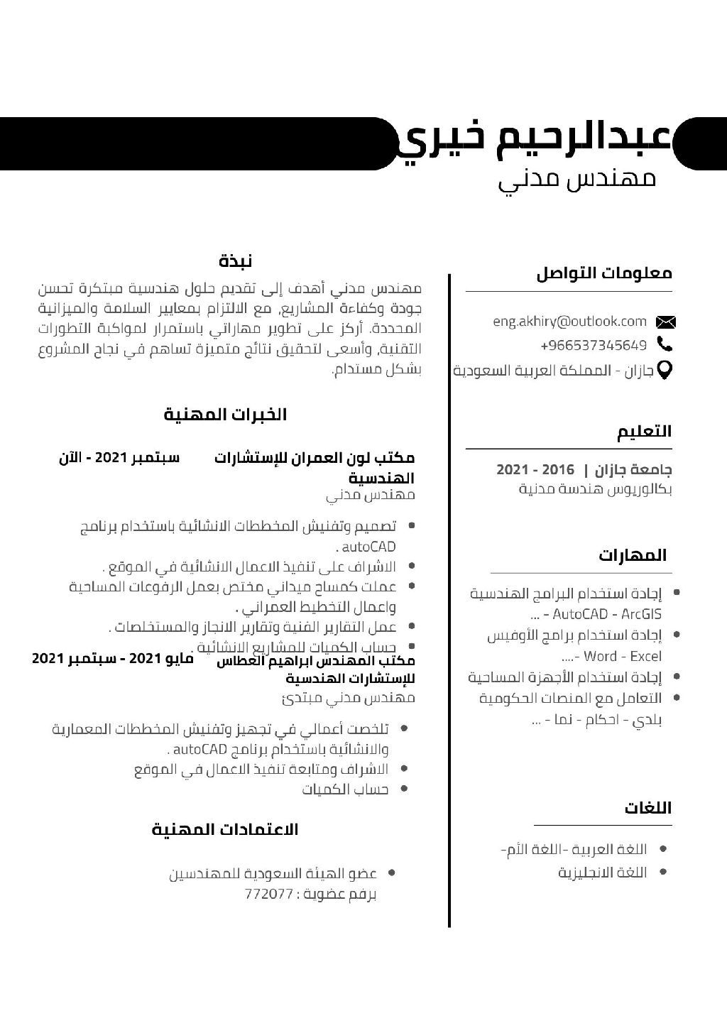 مهندس مدني بخبرة 5 سنوات في الاشراف على تنفيذ المشاريع الانشائية، اعداد المخططات باستخدام AutoCAD، حساب الكميات، وأعمال المساحة باستخدام الاجهزة المساحية. خبرة ميدانية في متابعة الأعمال بالموقع والتنسيق مع الجهات ذات العلاقة، مع الالتزام بمعايير الجودة والسلامة. عضو في الهيئة السعودية للمهندسين. السيرة الذاتية مرفقة)
