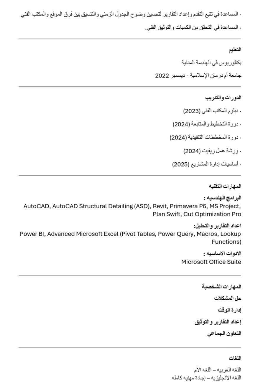 مهندس مدني امتلك الخبرة الكافيه في الاشراف على المشاريع وكتابة التقارير وأجيد مهام المكتب الفني مثل حساب الكميات وتخطيط المشاريع وعمل البرامج الزمنيه واعداد ومراجعة اللوحات التنفيذيه Shop drawings متقن لبرامج AutoCAD وAutoCAD structural detailing وPrimavera p6 ابحث عن فرصة عمل كمهندس موقع أو مكتب فني جاهز للانضمام فورا