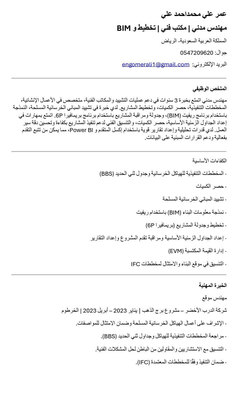 مهندس مدني متمكن من أعمال المكتب الفني وخبرة في الاشراف على المشاريع الانشائية لدي خبرة في اعداد الرسومات التنفيذية Shop drawings، حصر الكميات، وضمان جودة التنفيذ وفق المواصفات. أجيد استخدام برامج Revit وAutoCAD وPrimavera P6 وExcel واعداد التقارير أسعى للانضمام الى جهة احترافية لتقديم قيمة مضافة وتطوير خبراتي في التنفيذ والمكتب الفني