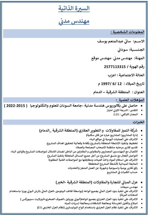 مهندس مدني سوداني حاصل علي درجة بكالوريوس في الهندسة المدنيه بتقدير ممتاز، بخبرة خمس سنوات في التخطيط والاشراف وانشاء هياكل المباني والتشطيبات والصيانة والترميم والحفر والهدم في المشاريع الهندسية ونظام عزل المباني، بارع في تقديم الاستشارات الهندسيه وتحديد المشاكل الفنية بسرعة وايجاد الحلول الفعالة لها. التطوير. أجيد استخدام البرامج الهندسيه