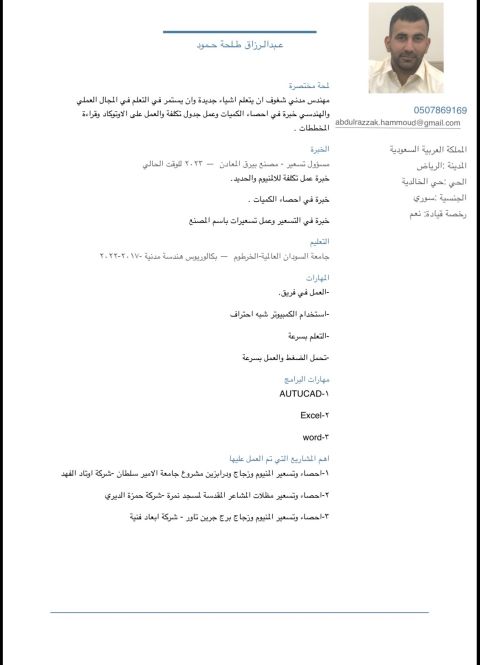 عبد الرزاق طلحة حمود مهندس مدني رقم الجوال 0507869169 البريد الألكتروني مكان الإقامة الرياض - المملكة العربية السعودية الجنسية سوري رخصة القيادة متوفرة الهدف الوظيفي مهندس مدني أسعى للحصول على فرصة عمل في مجال الهندسة المدنية، خاصة في أعمال الموقع والخرسانة والاشراف على التنفيذ