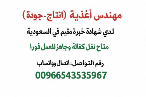 مهندس أغذية خبرة 10 سنوات في مجال الاشراف ومتابعة العملية الانتاجية وتحفيز العمالة لرفع الطاقة الانتاجية بأقل فاقد وبأعلى جودة. متابعة المشاكل الانتاجية والتنسيق بين الأقسام الأخرى (الجودة - الصيانة) اعداد التقارير والمراجعة الداخلية لتقارير حسب متطلبات الأيزو ومعرفة في الهاسب HACCP وكذلك GMP
