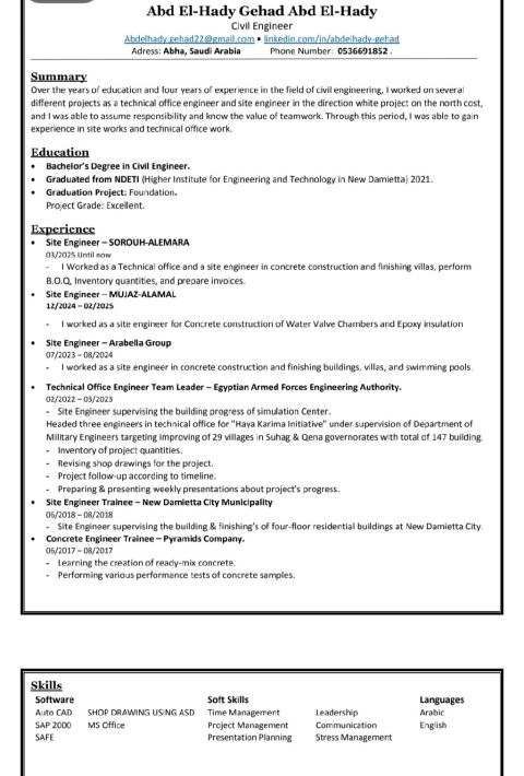 مهندس مدني خبرة 7 سنوات منها 5 سنوات داخل المملكة في أعمال التنفيذ والمكتب الفني والتسعير والتخطيط خبرة في مشاريع التطوير العقاري والأستيل استركشر وتسعيرات منصة اعتماد. المهام مراجعة المخططات المعمارية والانشائية ومطابقتها مع المخططات الكهربائية والميكانيكية عمل حصر كامل للمشروع وجدول زمني باستخدام بريما فيرا وتنفيذ كافة بنود العظم والتشطيبات من الحفر حتى تسليم المفتاح متواجد رخصة قيادة سعودية