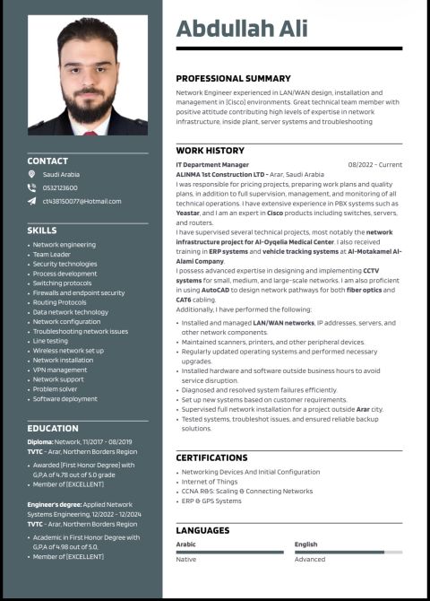 مهندس أنظمة شبكات تطبيقية متقدمة امتلك خبرة 3 سنوات في ادارة أقسام تقنية المعلوماتية وتطوير بنيتها التحتية، لدي خبرة في تصميم وتنفيذ وادارة الشبكات الصغيرة والمتوسطة والكبيرة بالاضافة الى ادارة أنظمة ERP بمختلف أنواعها، كما امتلك خبرة في ادارة الأنظمة السحابية، متاح للعمل في جميع أنحاء المملكة العربية السعودية، أملك تأشيرة زائر سوري