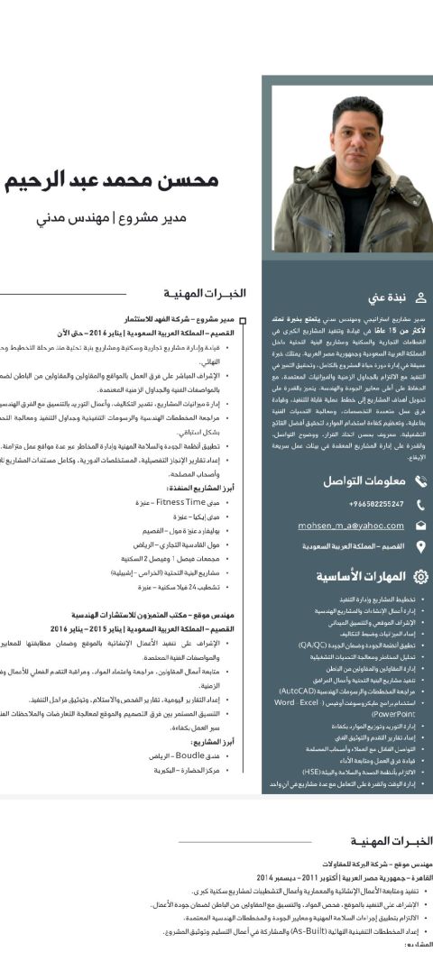 Civil engineer with 10 years of experience in Saudi Arabia + 3 years in Egypt. Supervising project execution. Experienced in infrastructure and construction projects, quantity surveying, and preparing payment certificates. Transfer of sponsorship available