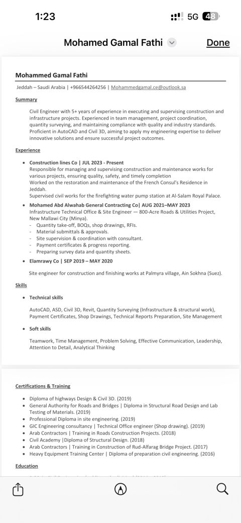 Civil Engineer with 5 + years of experience in roads, infrastructure, and utilities networks (water, sewer, stormwater) Skilled in Civil 3D, quantity surveying, site supervision, and technical office work, Material submittals & approvals, Payment certificates & progress reporting, coordinating with consultants, Preparing survey data and quantity sheets available to work across all regions of kingdom