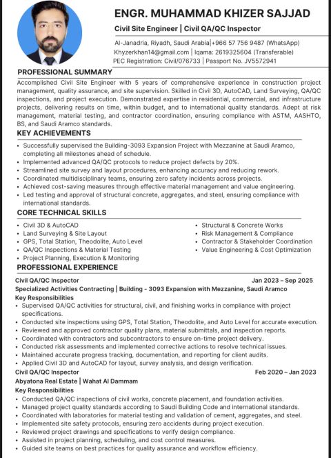 Civil Site Engineer or Site Supervisor, SCE registered having 15 years of experience in construction execution as a Civil Site Engineer, and Site Supervisor working with multinational Saudi, Turkish, Chinese, and Afghani companies on Buildings, Industrial (PEB) and power projects across Saudi Arabia, Pakistan, and Afghanistan. Available for immediate joining and relocation with Transferable Iqama