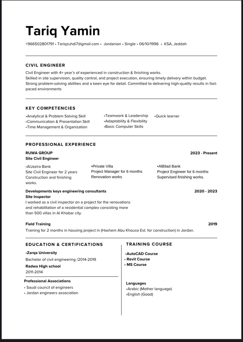 أنا مهندس مدني خبرة 4 سنوات في مجال التشطيبات والانشاءات ولدي اعتماد هيئة المهندسين ولدي سيارة وإقامة قابلة للنقل
