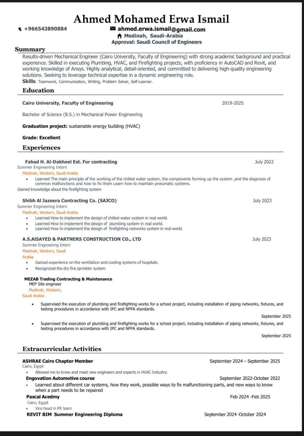 مهندس ميكانيكا سوداني الجنسية ومعتمد من الهيئة السعودية ومتقن لبرامج التصميم AutoCAD, Revit, Hap, Duct sizer, Pipe sizer ولدي خبرة في تصميم أعمال التكييف وتنفيذها وعملت في مشروعين عبارة عن مدارس لتنفيذ أعمال الصرف والحريق وابحث عن وظيفة مهندس موقع